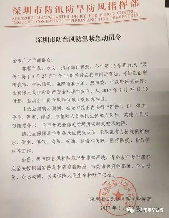 8月23日10时,受台风“天鸽”影响,深圳市气象台将台风橙色预警信号升级为红色。深圳三防指挥部同步启动防台风和防汛I级应急响应。I级响应期间,深圳全市范围内实行“四停”,即停工、停业、停市、停课。预计“天鸽”正面影响深圳市,深圳市平均风力将达12级以上(阵风14级以上),信号可能持续6—8小时,全市进入台风特别紧急防御状态。